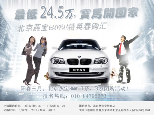 2010年3月27/28日两天,北京燕宝将在金港4S店举办“BMW精英春购汇——团购1、3系”大型活动。作为由燕宝官方组织的团购活动,我们将为您提供远低于市场指导价的超值报价,让您的BMW梦想变得触手可及。